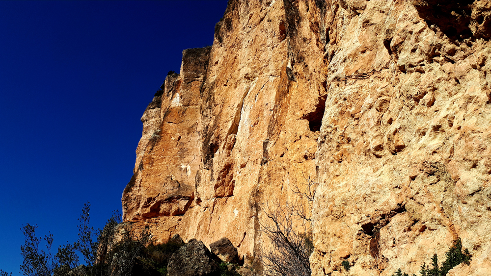A la izquierda de esta hay varias vías nuevas, escalamos la que empieza por terreno sencillo en placa grisácea tumbada hasta una reunión intermedia que hay debajo de un gran techo, hasta aquí más o menos 6a+/b. El siguiente largo pasa por el techo, es bastante físico. El grado…7a+ ?