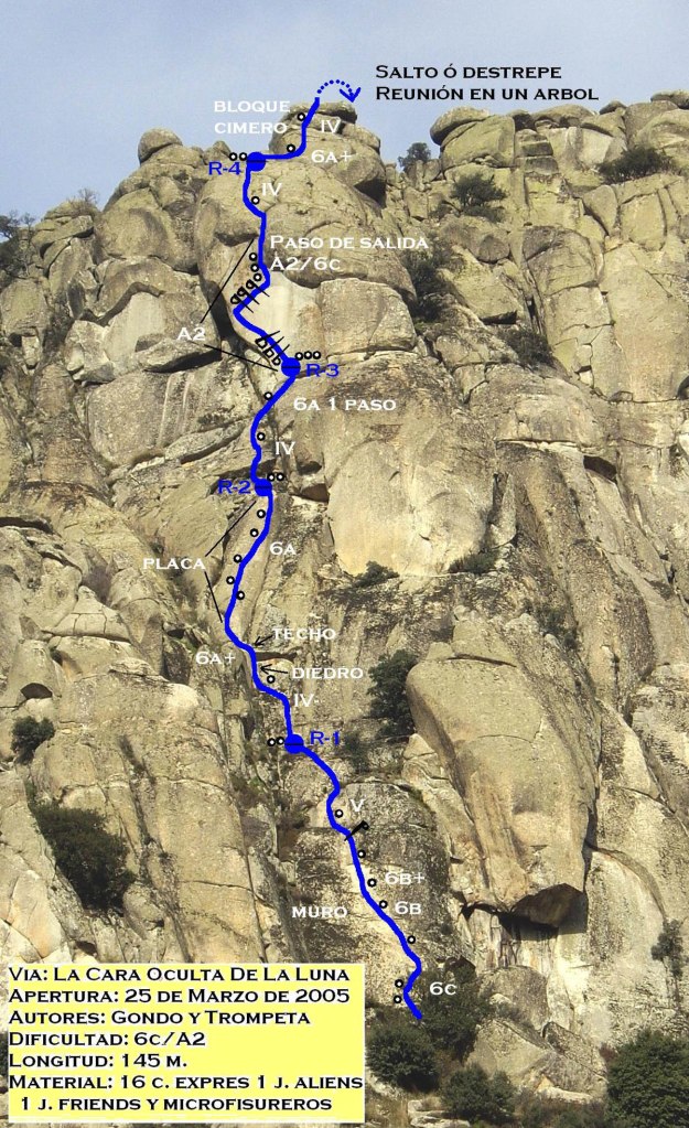 Como decía, hace tiempo, tras realizar un sin fin de duras escaladas se me pasó por la cabeza la posibilidad de liberar el largo de 6c/A2 de la vía «Cara oculta de la Luna» en el margen izquierdo del Pico de la Miel.