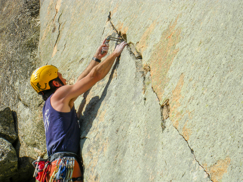 La línea es intimidante, un liso muro verdoso bastante vertical rajado por una fisura casi milimétrica y un bombito de salida. A simple vista «te da la risa» pero cuando le prestas atención ves posibilidades. Hace años esta fisura tenía 3 clavos, yo llegué a ver hasta 4 (pero uno de ellos se salió y ahora forma parte de mi colección «clavos sacados con la mano»), supongo que con el paso del tiempo se han ido quitando.