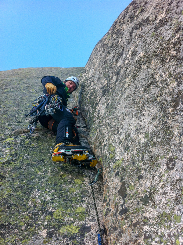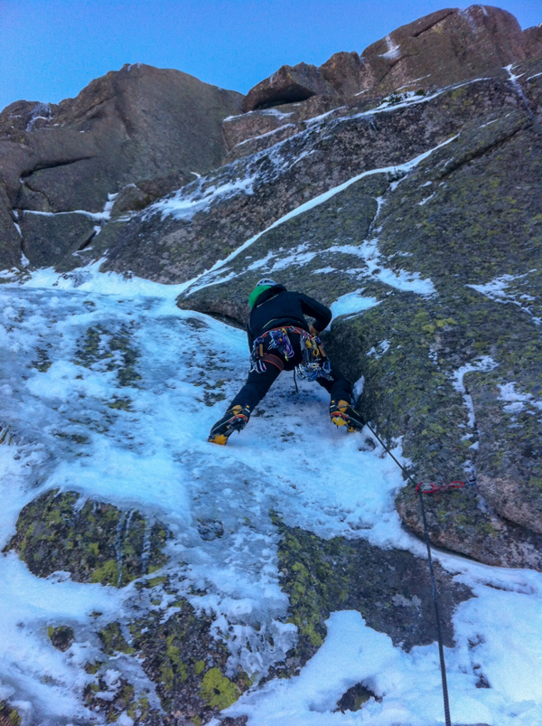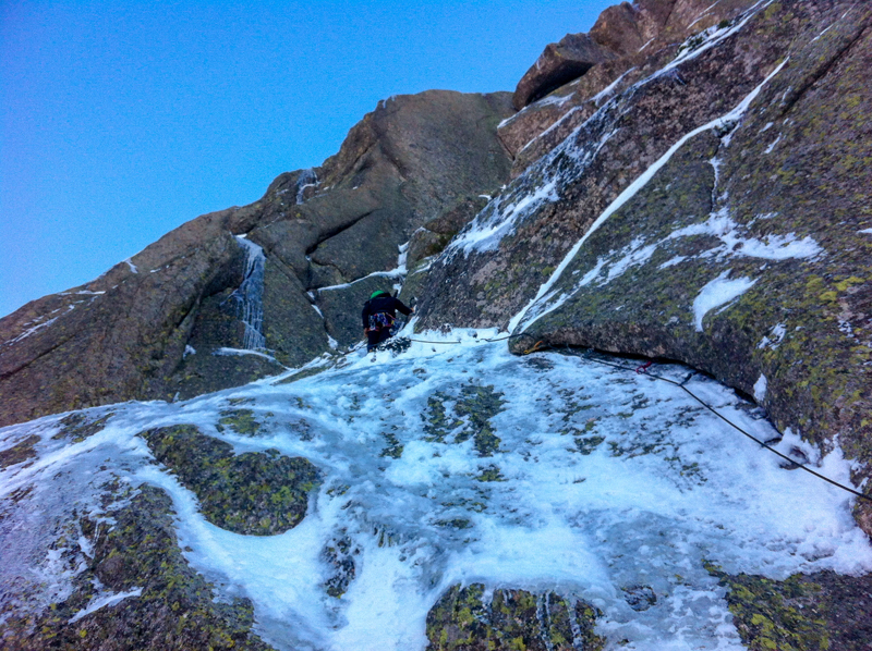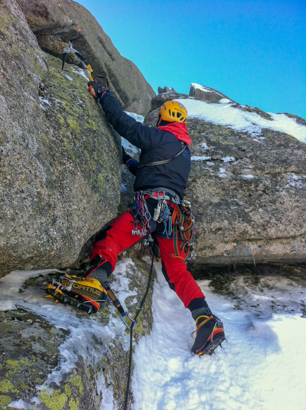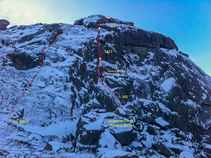 Nosotros repetimos el Diedro norte, escalada de tres largos más técnicos y expuestos que lo anteriormente citado. El primer largo es técnico, no se protege mal del todo, pero tiene unos primeros metros bastante difíciles con pies en placa con 1 centímetro de nieve. Más tarde, aprovechando unas canales verticales con algo de nieve-hielo hago una pequeña variante que me ayuda a llegar a la base del diedro, en donde monto reunión.