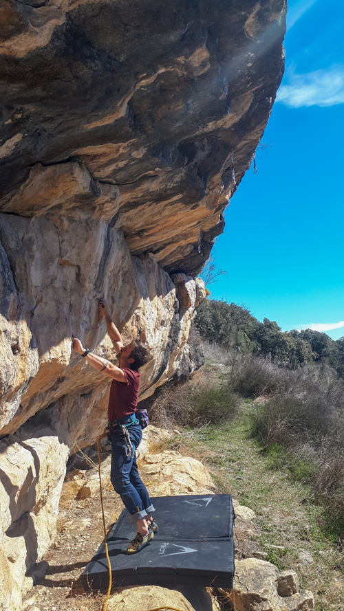 Y esto consiste la siguiente propuesta, entradas de bloque protegidos por Crash pad y diferentes combinaciones de travesía a la suficiente altura como para hacerlo asegurado con cuerda (mucha atención al asegurar y útil la tan famosa «caña«). Un «engendro» que te castigará brazos, manos y piel.