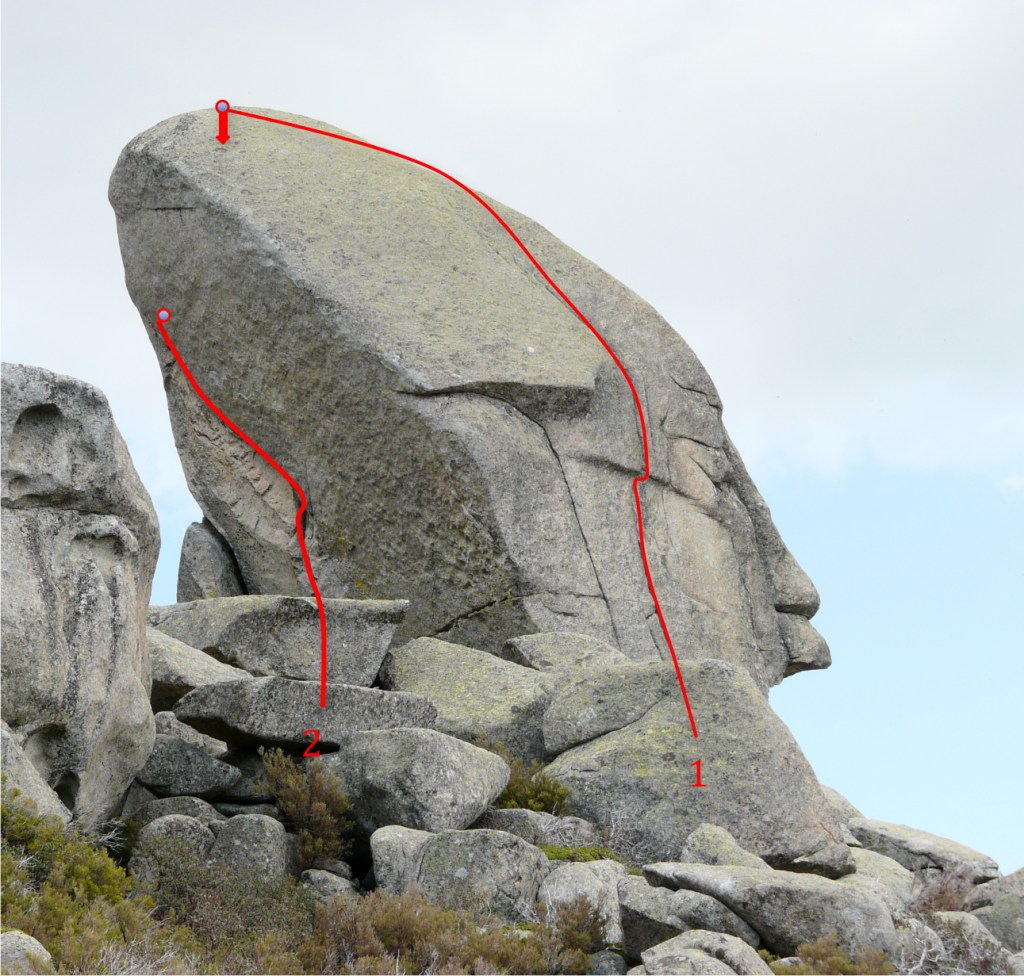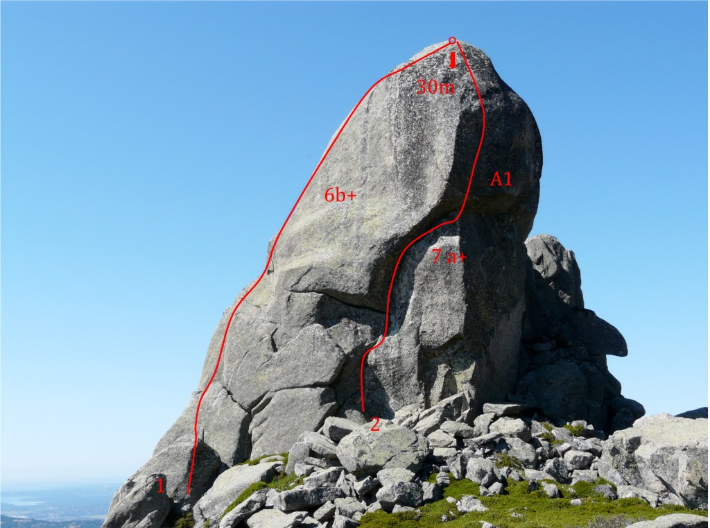 Espectacular trazado abierto por A. Fernández y C. González. La vía transcurre por una técnica y dura beta de cuarzo. Descenso en rápel por la misma cara o destrepando por la cara opuesta.