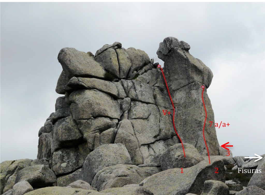 Nota: un centenar de metros más arriba encontramos un pequeño muro con dos fisuras bien visibles. Su dificultad es de V y están limpias.