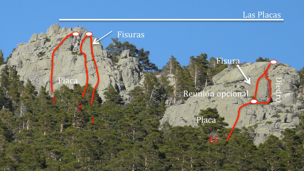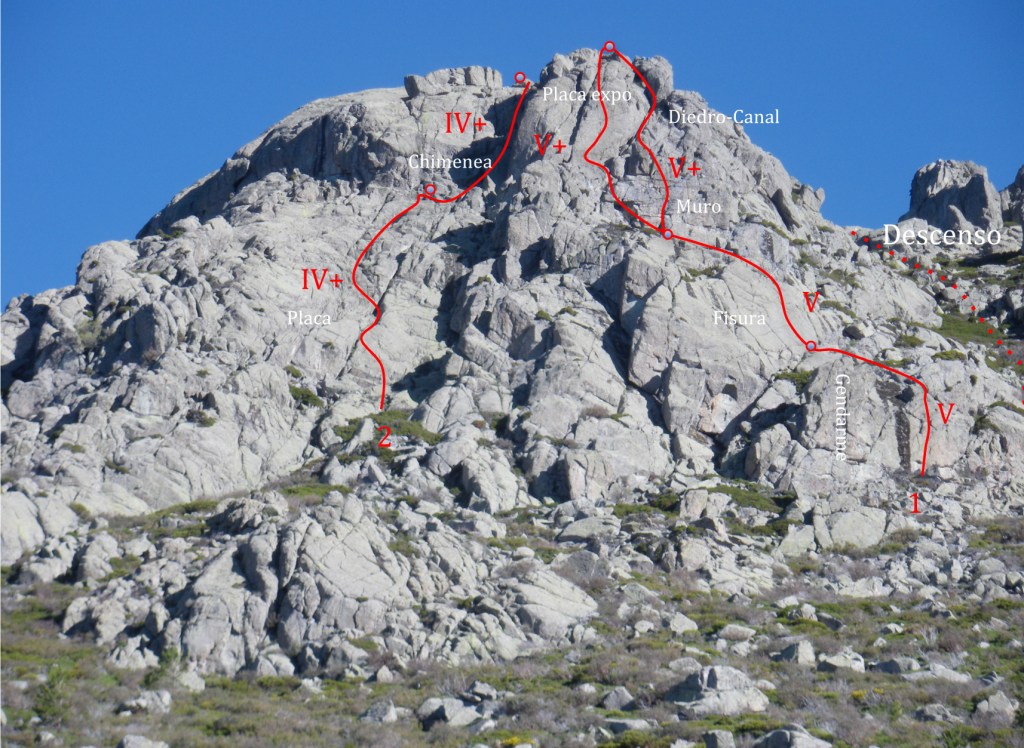 Itinerario, ya abierto, que transcurre por la aguja izquierda. Encontramos un clavo protegiendo el paso más duro de la vía. Hay que prestar atención al segundo largo en placa expuesta.