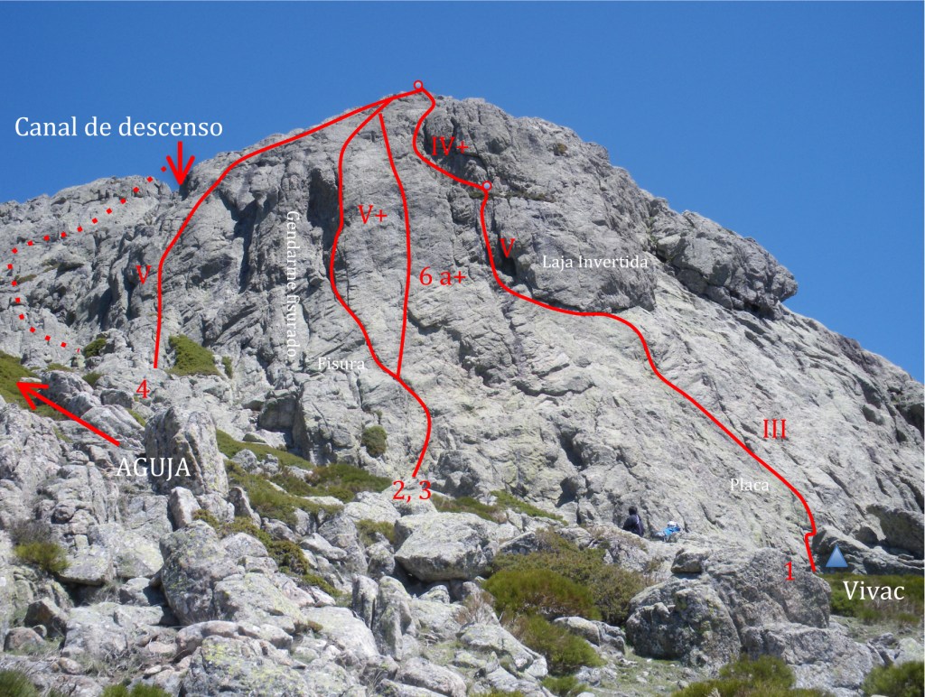 Itinerario abierto posiblemente en los 80. Comienza, justo en la vertical de un pequeño vivac, por una placa sencilla protegida por cuatro Spits. Bordea por la izquierda la gran laja invertida para superar un corto resalte hasta un repisa, reunión en dos Spits. El siguiente largo comienza por nuestra izquierda por unas fisuras para más tarde, por terreno sencillo, llegar a la cima. Llevar Friends.