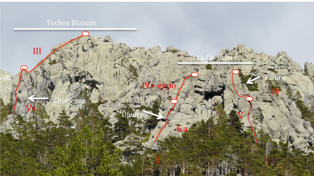 Abierta por J. García, R. García y C. González en un curso de la Emam. Variado recorrido que empieza por un murito a la derecha de una chorrera negra bien visible. El segundo largo quizás sea el mejor, escalando una placa fisurada. Podemos terminar la ruta por dos opciones, la primera es superar un corto pero vertical muro para continuar por un Diedro-Canal, o ascender por una pequeña chimenea para más tarde superar una placa vertical algo expuesta. Limpia, llevar friends variados y empotradores.