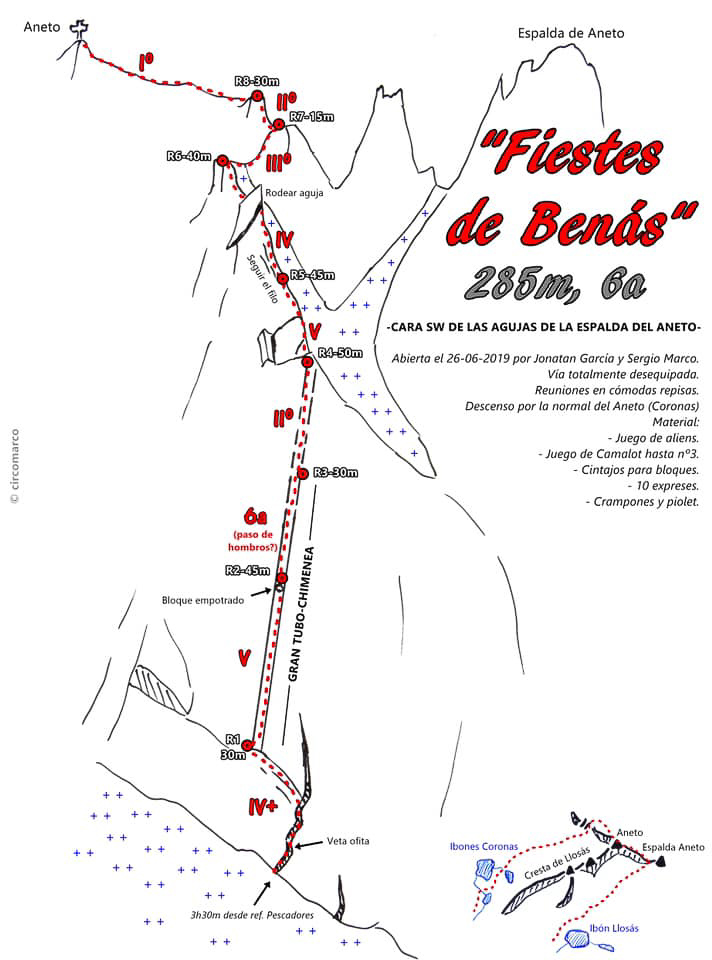 La línea transcurre por un bastión rocoso próximo a la Espalda del Aneto y su aproximación resulta evidente gracias a la profunda «grieta-chimenea» que rasga la pared y que la hace inconfundible. Yo diría que es una forma elegante y divertida de ascender el Aneto.