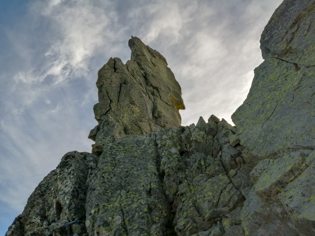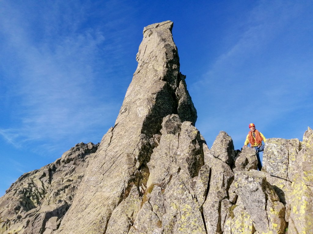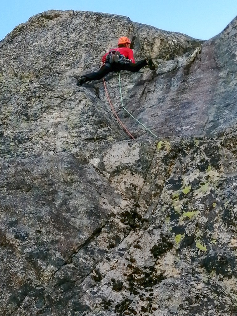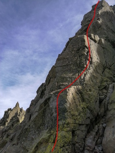 Normal IV+, esta escalada es sin duda la más sencilla de las agujas. Ascendemos por un sistema fisurado, sin más complicaciones, que superar un corto resalte en donde estas se estrechan (dos clavos).