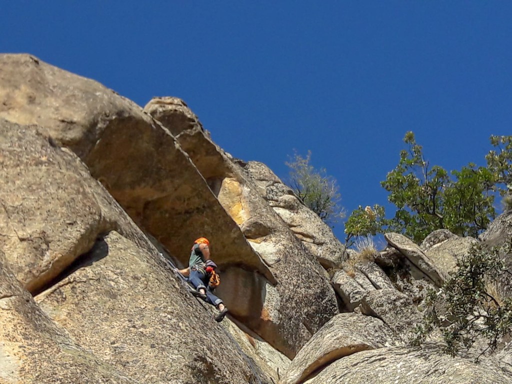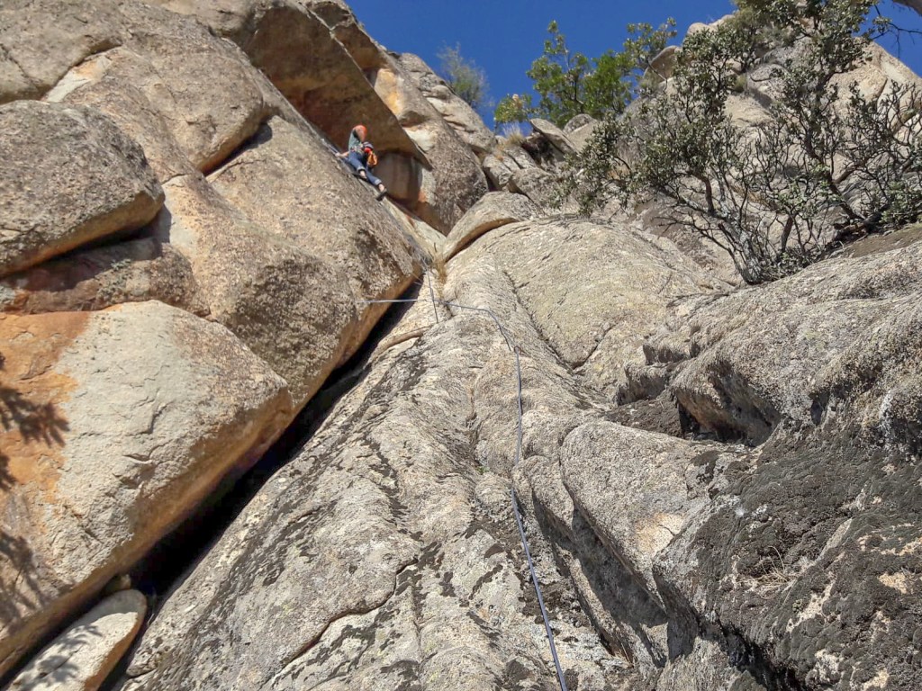 Esta fisura se supera en artificial, tiene muchas posibilidades en libre, para pasar a Ae en donde se ciega. Pero no te confíes, el largo no termina ahí. Te queda una placa de adherencia con seguros lejanos, un poco de susto si has subido con las «Jomas», hasta llegar a la primera reunión.