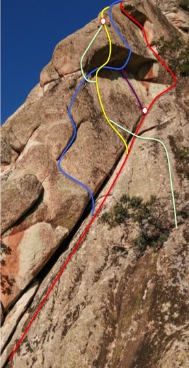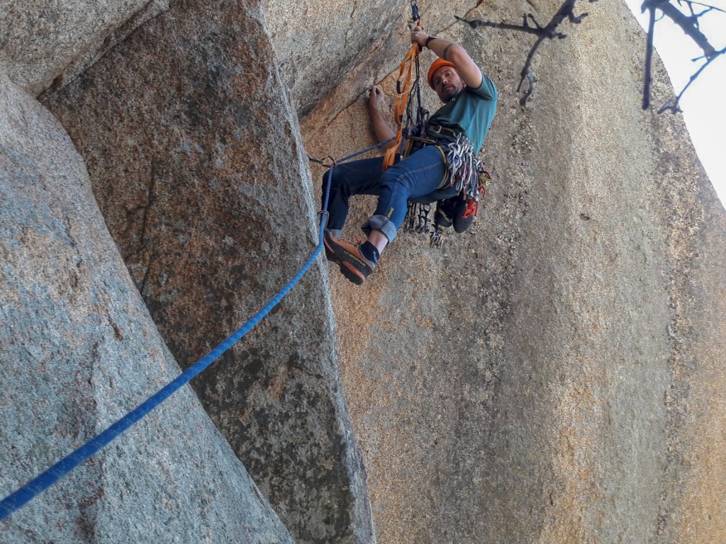 Entré por el primer largo de la «Rodolfo V», una fisura sucia pero de escalada técnica. Un poco antes de llegar a su primera reunión (reequipada) encontramos en la placa de la izquierda los seguros que se dirigen hacia el techo, por la «Variante A1». Escalada técnica con algún pasito hasta ponerte justo debajo del techo.