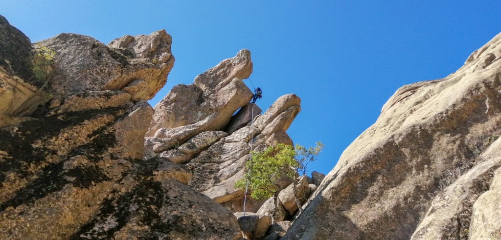 En otro largo más te colocas en la cumbre, mucho cuidado con los cordinos del rapel. Están «deborados», mejor detrepar con cuidado a la instalación que existe más abajo.