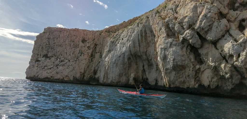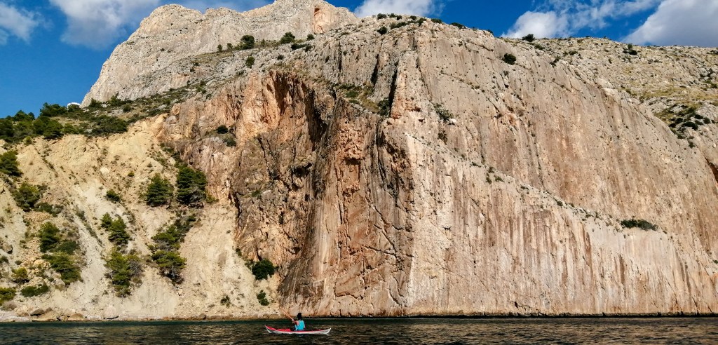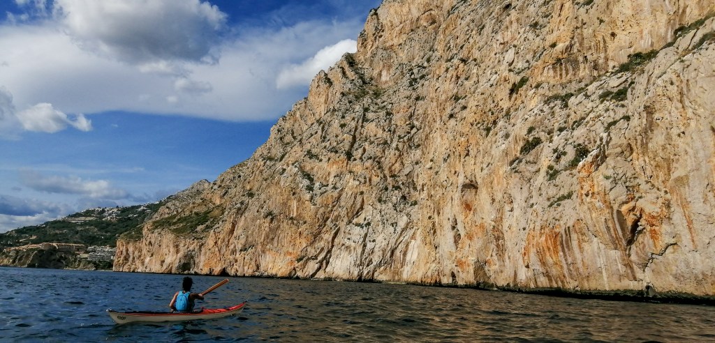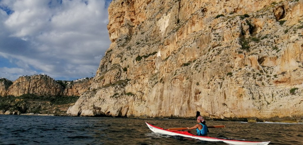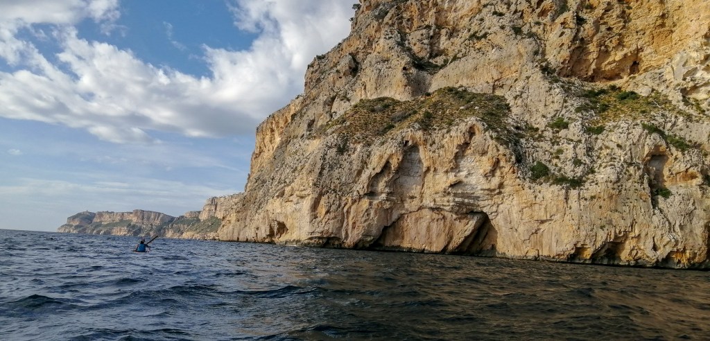 Tras contar la secuencia de olas, embarcamos rápidamente y partimos rumbo a Granadella. Al doblar el Morro de Falquí lo «flipamos», teníamos por delante cerca de 4 kilómetros de acantilados con Marejada Fuerte. Un caos de olas totalmente desordenadas, de 2 a 3 metros de altura, que te batían y zarambeaban en todas las direcciones. Y que en ocasiones rompían sobre nuestros Qajaq, produciéndonos una sensación sobrecogedora.