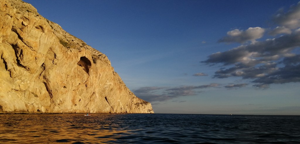 Partimos, Oli y yo, de la playa del Albir. Esta vez salimos pronto, la tendencia del viento es a ir aumentando a lo largo del día, y eso solo puede predecir algo malo. He de decir que si la travesía anterior era apta para todos los públicos, esta tiene algunas zonas en donde hay que ir atentos.