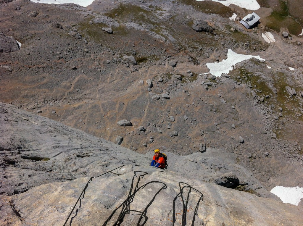 Yo lo cojo con ganas, pues ya no me volveré a parar hasta encontrarme en la canal que da acceso a la arista cimera, muchos metros ya por encima y pasados ya los largos difíciles. Allí decidimos escalar sin cuerda, es terreno sencillo pero de ir con ojo. Un gran nevero aún cubre gran parte de la canal y tenemos que ir haciendo peripecias para poder seguir ascendiendo.