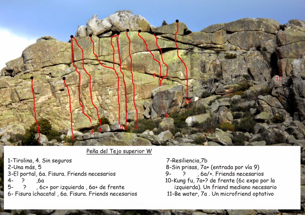 Para mi es la mejor zona de escalada de Valdemanco, se accede tranquilamente desde la pista. Aunque habrá que prestar atención para llegar a los sectores más alejados. Podemos encontrar duras y antiguas escaladas sobre placas verticales de regleta y fisura a proteger peleona.