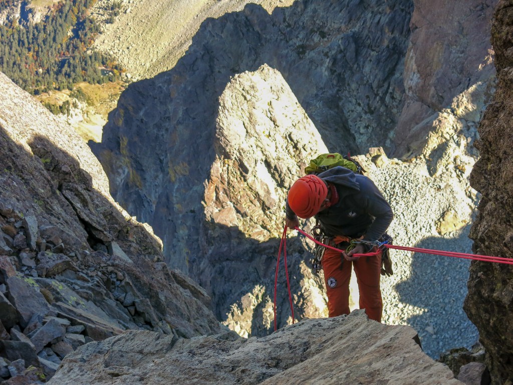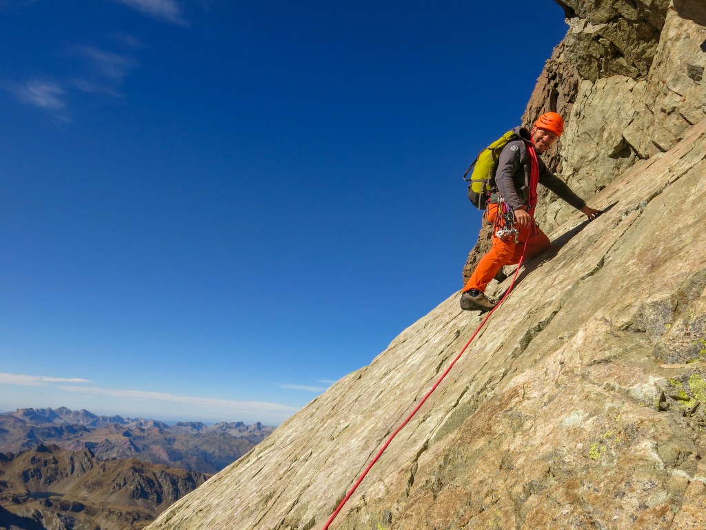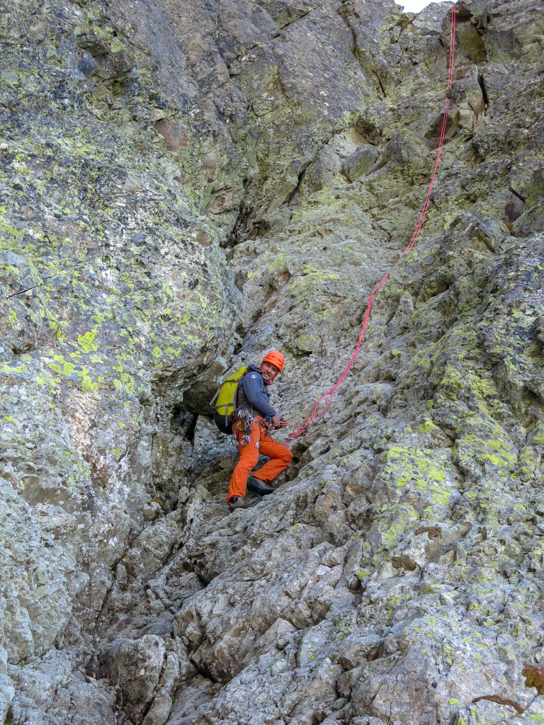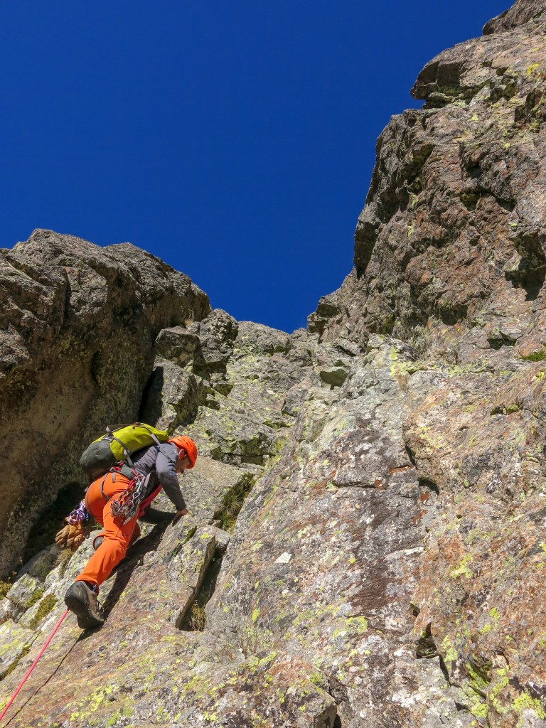 Continuaremos el recorrido en descenso hasta encontrar los rapeles que nos depositan en el collado de la Fourche. Desde éste, ascendemos por terreno sencillo pero caótico hasta la base de unas placas lisas características que superamos con tendencia a la izquierda para enlazar con un sistemas de chimeneas y resaltes (III y IV) hasta la arista que nos deposita en la cumbre del Grand Pic.