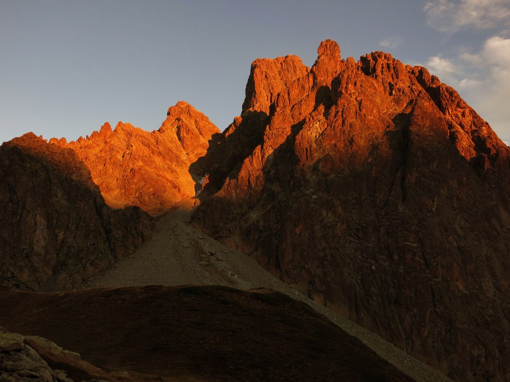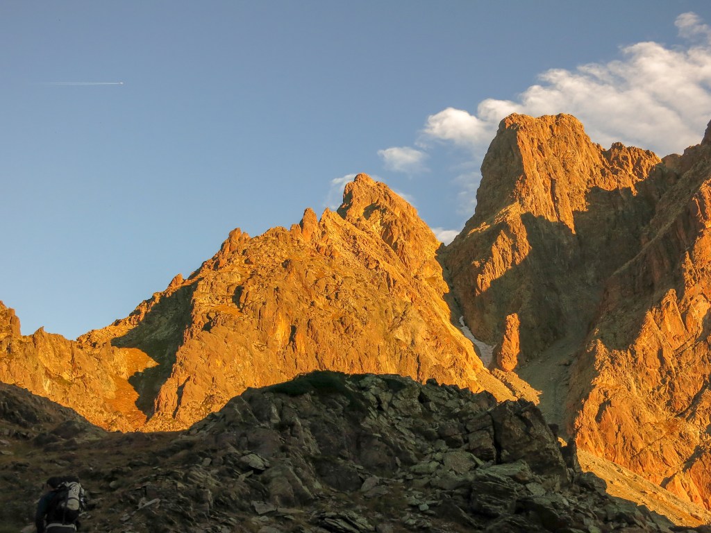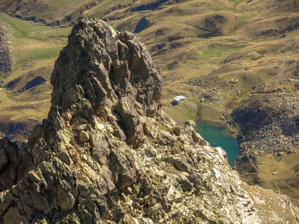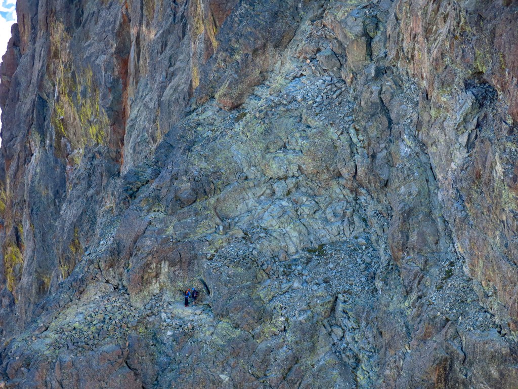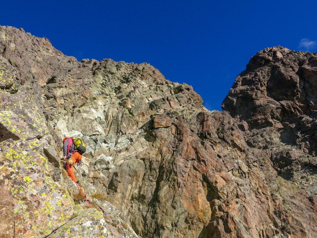 Continuaremos el recorrido en descenso hasta encontrar los rapeles que nos depositan en el collado de la Fourche. Desde éste, ascendemos por terreno sencillo pero caótico hasta la base de unas placas lisas características que superamos con tendencia a la izquierda para enlazar con un sistemas de chimeneas y resaltes (III y IV) hasta la arista que nos deposita en la cumbre del Grand Pic.