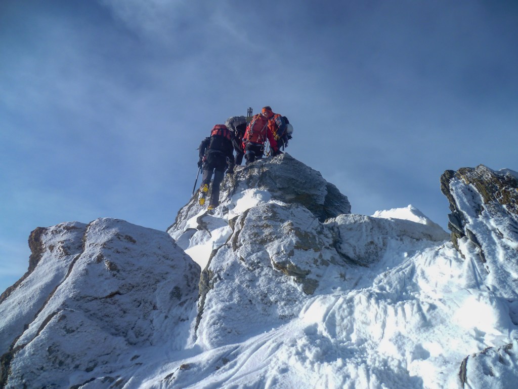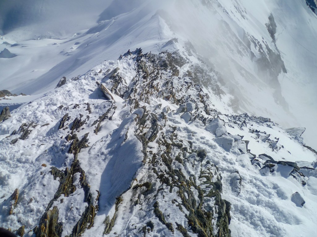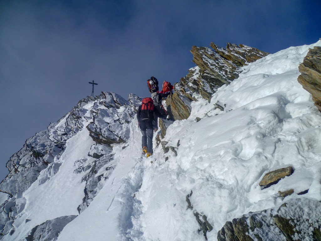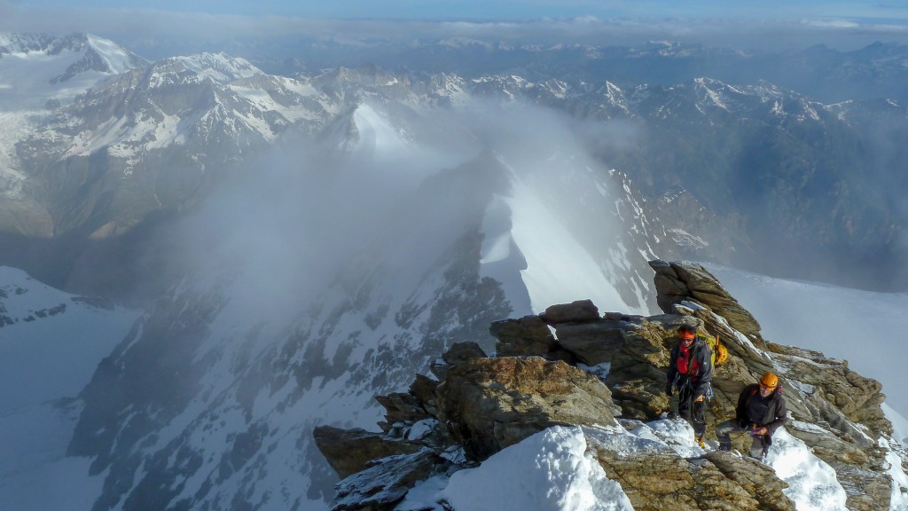 He de deciros que nos gustó mucho, la ascensión es una larga travesía por una cresta, que hace de balcón hacia la cara noreste del Lenzspitze (parecía que nos quería dar en los morrros). En algunos tramos puede resultar expuesta, hay que prestar atención en los últimos metros antes de la cumbre (sobre todo en el descenso) y en algún paso de travesía con «hielo vivo«.