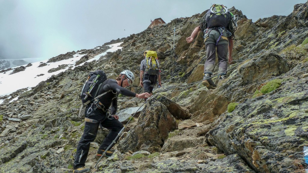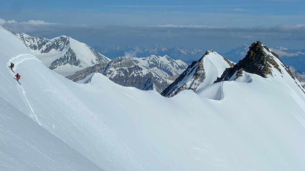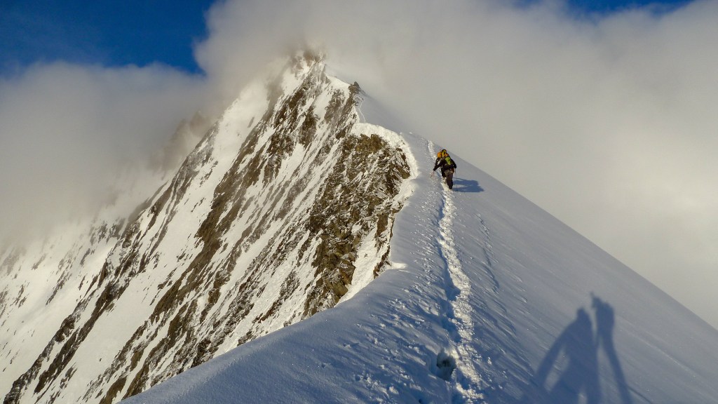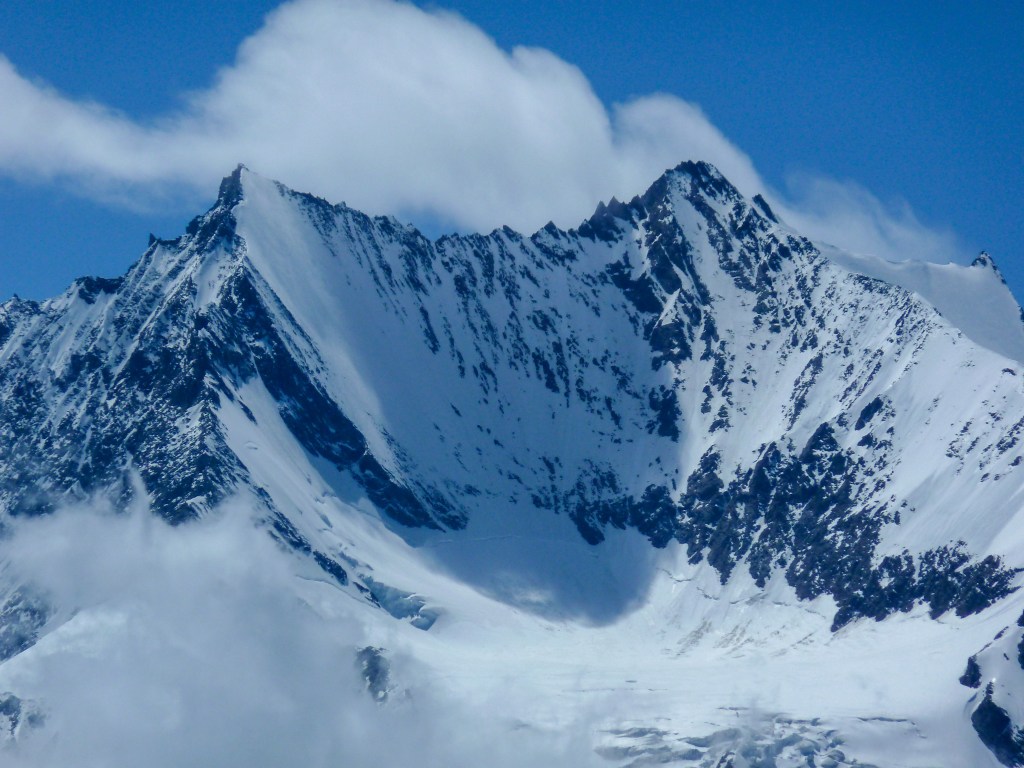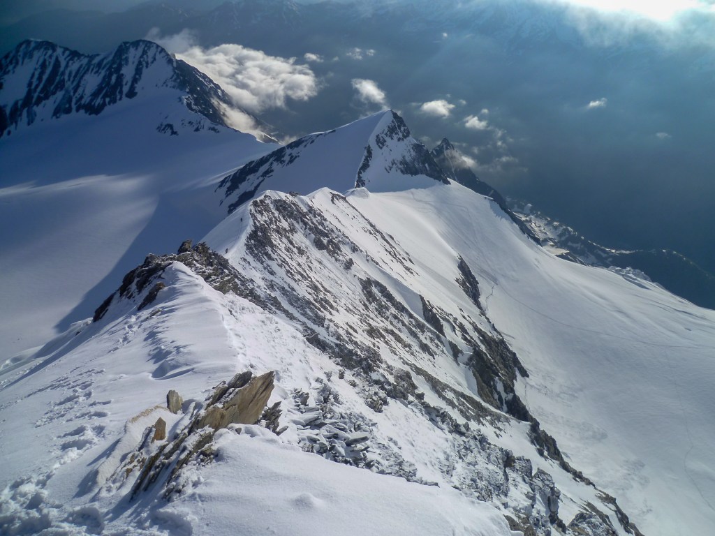 He de deciros que nos gustó mucho, la ascensión es una larga travesía por una cresta, que hace de balcón hacia la cara noreste del Lenzspitze (parecía que nos quería dar en los morrros). En algunos tramos puede resultar expuesta, hay que prestar atención en los últimos metros antes de la cumbre (sobre todo en el descenso) y en algún paso de travesía con «hielo vivo«.