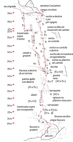 La ruta en sí no tiene pérdida, recorre el sistema de diedros y fisuras más evidentes que surcan la pared (cordinos y clavos adornan la roca). En lo único que deberemos prestar atención es en hacer una larga travesía aérea hacia la izquierda cuando la chimenea se hace más ancha en la parte superior.