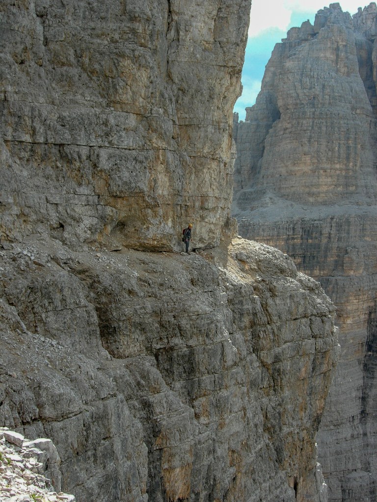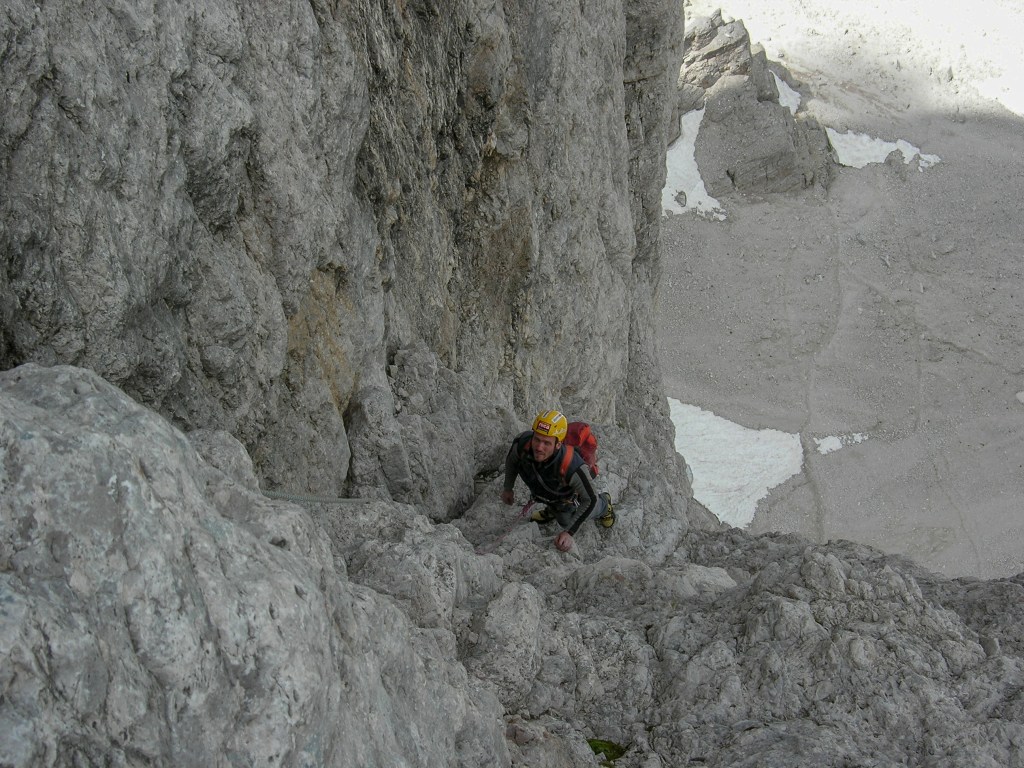 Nos repartimos la vía en dos partes; yo escalaría todos los largos hasta donde acababan las dificultades. Y Carlos tomaría las riendas hasta llegar a la cima, en los largos considerados fáciles. No os dejéis engañar por este hecho; podrían ser de menos dificultad, pero era en donde se concentraba la esencia de la escalada en Dolomitas. Roca descompuesta, largas travesías, cascadas de agua en las chimeneas y sin un solo seguro fijo.