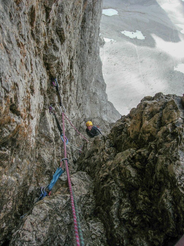 La característica roca dolomita, la verticalidad que en ocasiones roza el desplome, el tacto, la humedad, el frío, el vetusto aseguramiento, el sombrío paisaje… Todo se une para recibirte en los cerca de 600 metros de desnivel de escalada; solo hay que armarse de valor e intentar disfrutar.