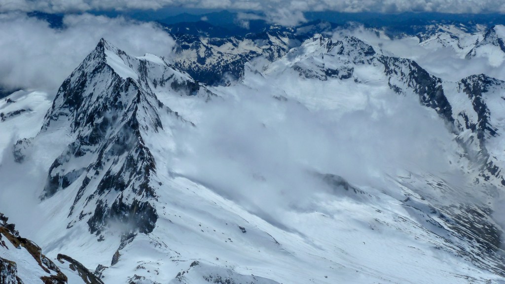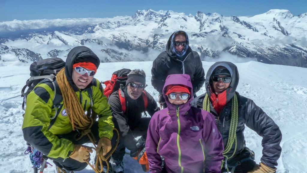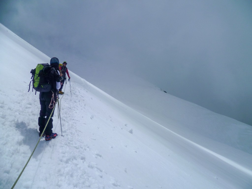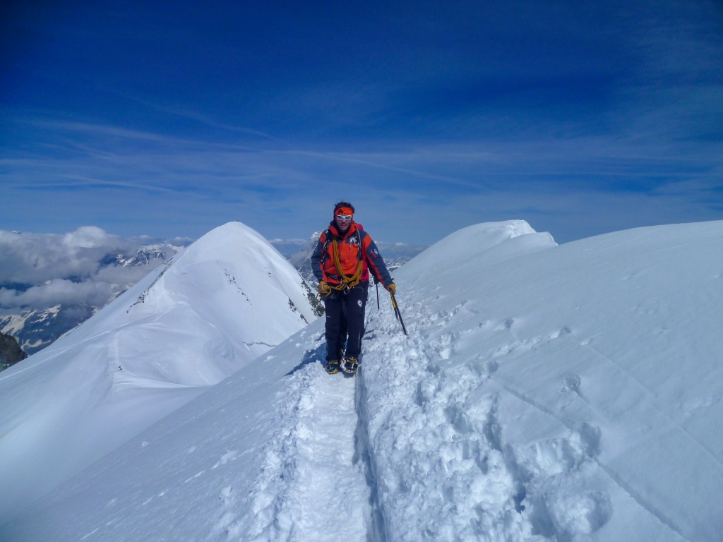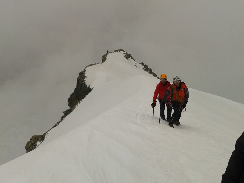 Este cuatromil es el más técnico de la jornada, para llegar a su cumbre deberemos progresar por alguna pala de nieve empinada y algunos pasos de roca complicada. Encontramos tramos de cuerda fija que facilita el ascenso, así como instalaciones para rapelar en el descenso.
