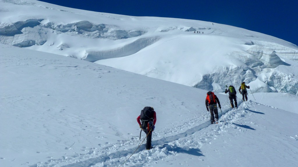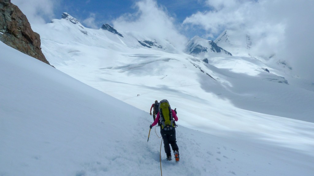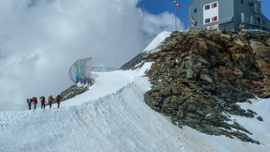 Comenzamos la aclimatación ascendiendo el conocido Weismiess 4.023 m, una «relajada» actividad que parte a la cómoda altura de 3000 metros. No si antes ascender, usando los teleféricos hasta la estación superior, en el plató del glaciar.