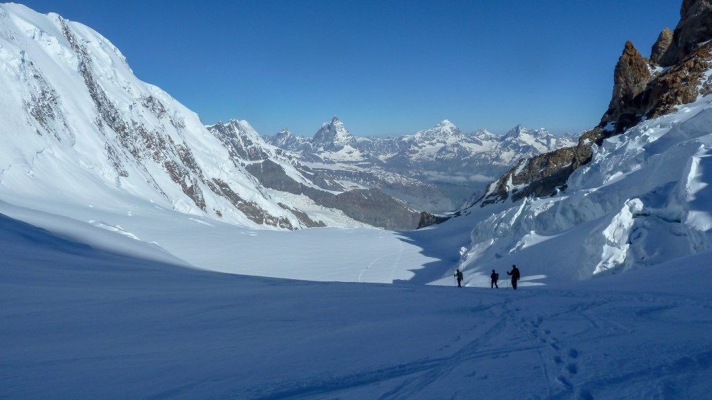 A partir de aquí, continuamos el descenso (equipado con maromas en la parte inicial) por el glaciar Monte Rosagletscher, hasta la vaguada Scholle, donde horas antes nos hemos desviado.