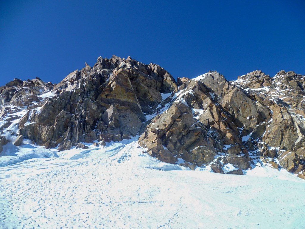 Deberemos prestar atención en la parte superior, ya que nos desviaremos para ir a buscar las laderas que descienden de la Cresta Oeste de Dufourspitze. Unas empinadas rampas de nieve/hielo que terminan en una afilada arista rocosa.