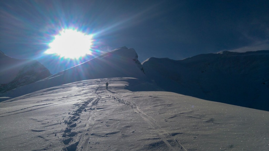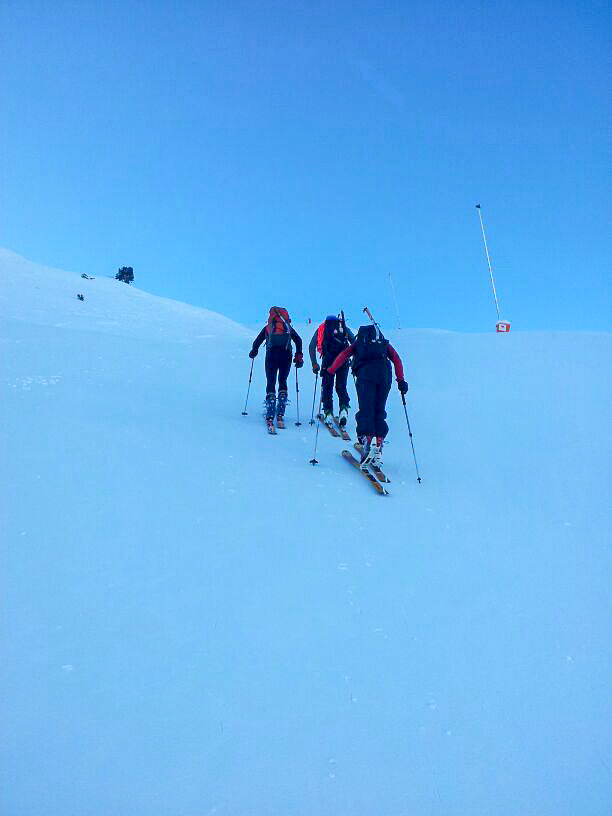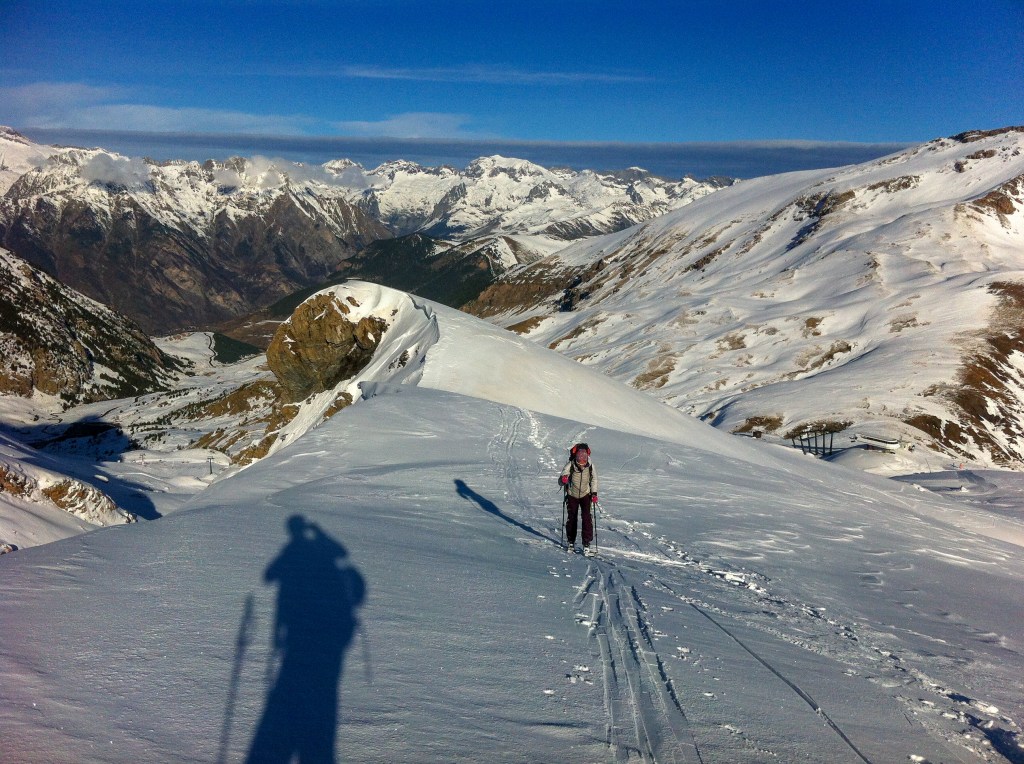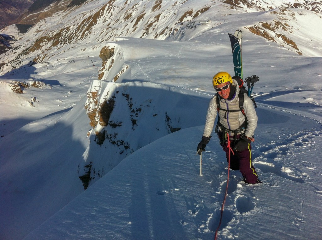 Una vez en este, abandonaremos el dominio esquiable y comenzaremos el ascenso (primero con esquís y más tarde ya andando) de las laderas empinadas que ascienden los primeros montículos. El camino poco a poco se va estrechando y la arista, pese a ser sencilla, nos va dejando sensación de vacío.