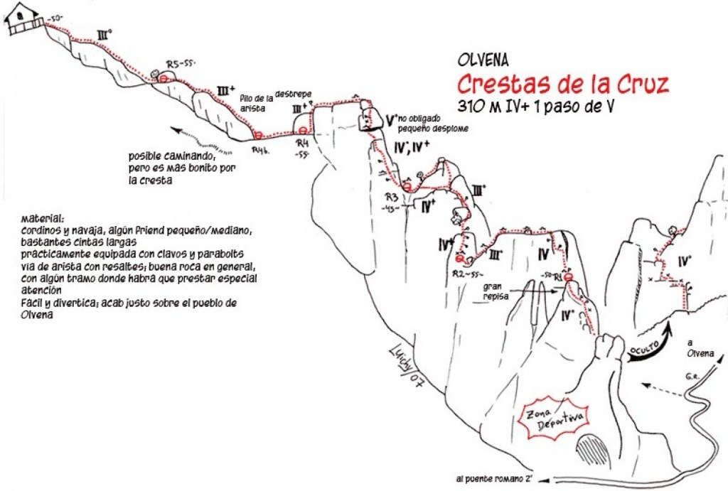 - L3: Inicio por un diedro para más tarde continuar por la fisura de la derecha hasta unas repisas. Desde la repisa subir directo, y poco antes de llegar a la cresta desviarse ligeramente a la izquierda hacia la reunión que está en un par de árboles unidos por una cuerda.