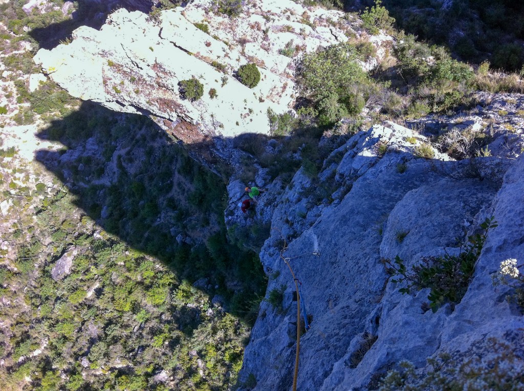 El descenso empieza con un rápel desde una enorme P, para más tarde realizar un destrepe para llegar al collado, donde hay otro rápel desde un árbol. La ruta se puede escalar con cuerda de 40 metros.