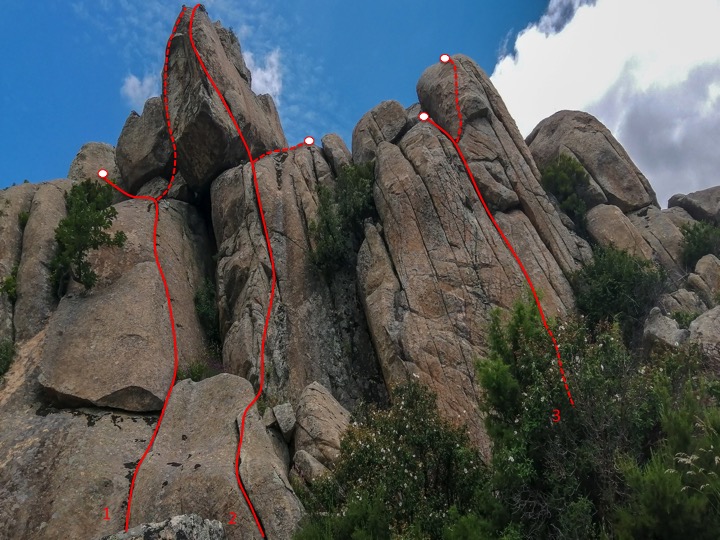 La fisura de entrada hasta la repisa estaba abierta ya (máximo V+) con reunión en una sabina en un cordino. Nosotros escalamos la variante por el «Dado» (6a/+) en una bonita escalada de setas y placa. Llevar friends variados y cordino para puente de roca, reunión a montar.