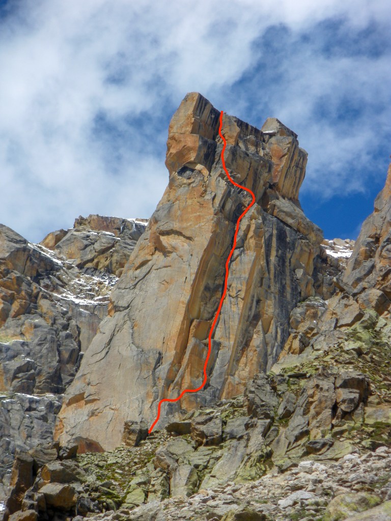 En el margen derecho de dicha formación rocosa encontrábamos una sucesión de fisuras y diedros que ofrecían una elegante forma de ascender hasta la cumbre. Así que cargamos con todo nuestro material y ascendimos hasta la base de la misma, en un día que parecía que iba a ser bueno.