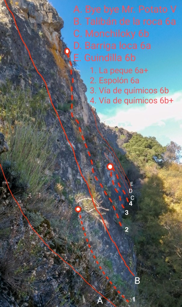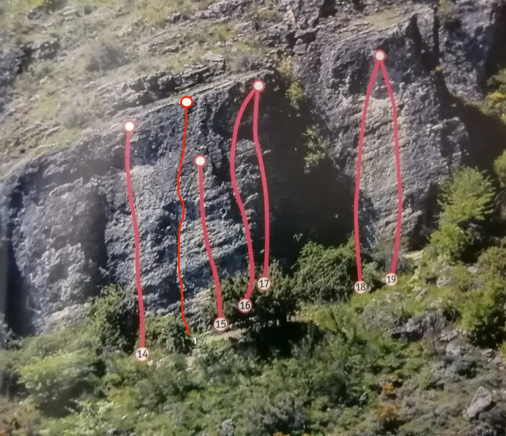 En la parte final del farallón rocoso encontramos este sector de escalada vertical de regleta y agujeros, es una zona que merece una visita. Todas las vías y reuniones están reequipadas con parabolts.