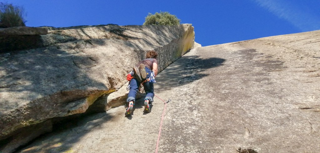 Después de este maravilloso largo, uno de los mejores de la zona centro en su grado, proseguimos por una placa de adherencia para hacer reunión debajo de un murito (se hacen perfectamente los dos largos en uno). Este se puede superar por diferentes rutas, a la izquierda (IV+), por el centro (7?) y a la derecha (chapas blancas, 6c).