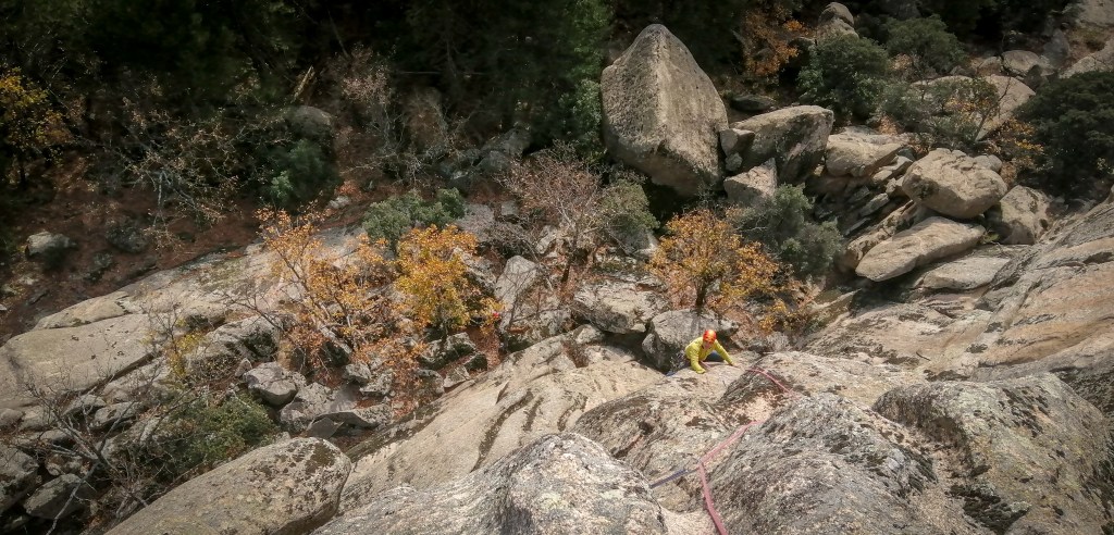 El primer largo es anecdótico, con algún pasito V+. El segundo es el que realmente merece la pena, comienza por una ancha y extraña fisura que te deposita en un muro vertical de buen canto. Cuando la fisura desaparece y tras realizar una pequeña travesía a nuestra izquierda, superamos un par de panzas con pasos obligados hasta llegar a unos mogotes de cuarzo que nos dejan en la reunión, 6b (mejor ir con el gradito asentado).