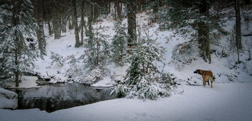 El paisaje se ha transformado drásticamente, hace frío y en nuestro interior se ha instalado una absurda felicidad que nos arranca una sonrisa cada vez que nos miramos Oli y yo. No somos los únicos en disfrutar del manto blanco, Po corre alocadamente entre los árboles que forman este frondoso bosque y las diferentes inclinaciones del terreno, que en ocasiones hacen descender al alborotado cánido dando tumbos.