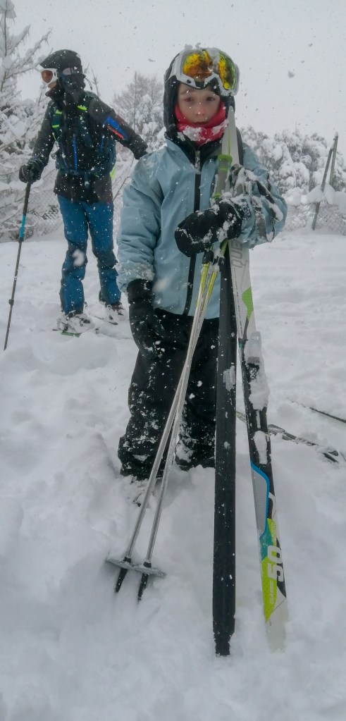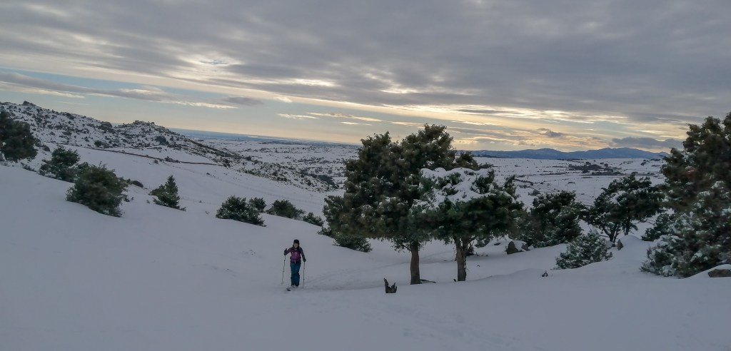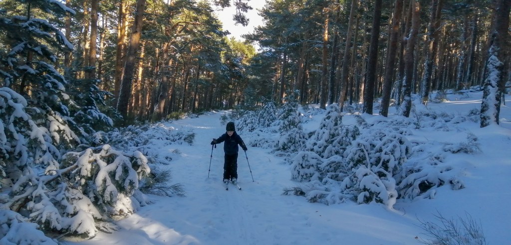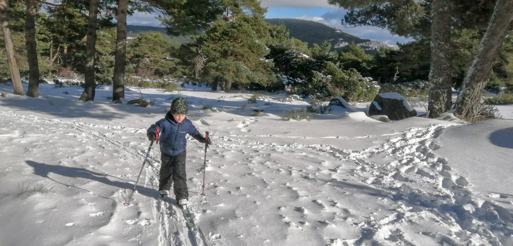 Durante todo este tiempo también hemos podido disfrutar del Backcountry por la sierra de Guadarrama, iniciando a H en esta materia. Largas rutas por el Puerto de Canencia, ascensión al pico Perdiguera y cómo no, no podía faltar el típico paseo con esquís por las inmediaciones del hogar bajo la intensa nevada.