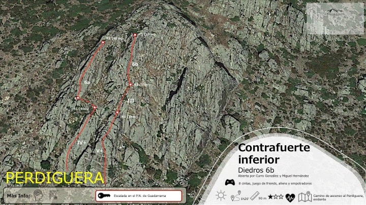 Más a la izquierda existe otra combinación parecida a la anterior pero de menor dificultad, una línea de placa en el primer largo y diedro tumbado en el segundo (algo más expuesto pero más sencillo).