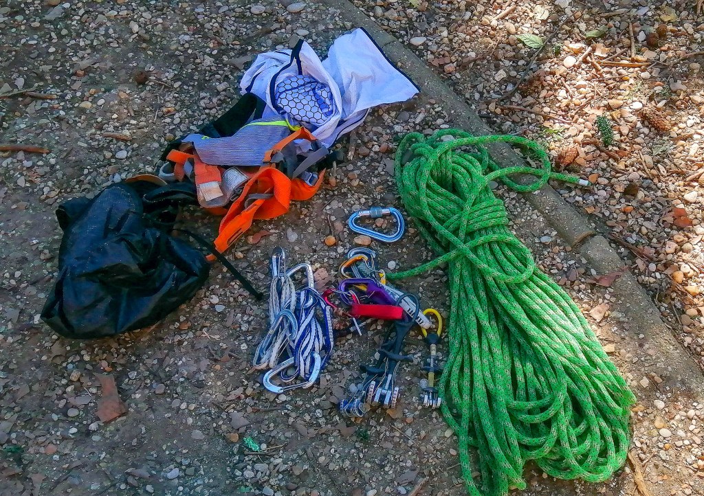 Un factor a tener muy en cuenta en estas actividades es el peso, siempre intentamos ir lo más ligero posible, no por emular a las grandes estrellas de lo mediático, sino porque cada gramo cuenta a medida que sumamos años. De esta manera, generalmente usamos unos arneses hiperligeros, poco material de autoprotección y diferentes cuerdas que tenemos «apañadas» para ésta y otras actividades.