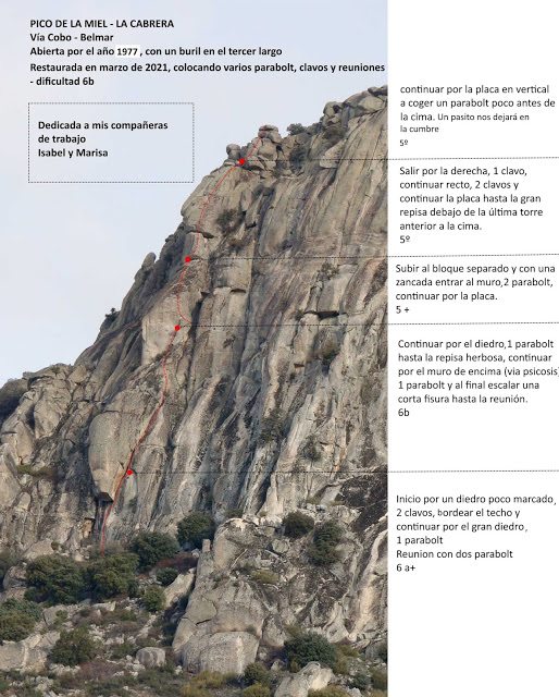 «Actualmente conocida como la Vía del Cobo, se bautizó en su momento como Vía BELMAR, dedicándose a unas compañeras de trabajo de aquellos tiempos, Isabel y Marisa. La vía la abrimos, creo recordar con Pedro Coronado (aunque no estoy seguro) y el año de apertura sería por 1.977 aprox/