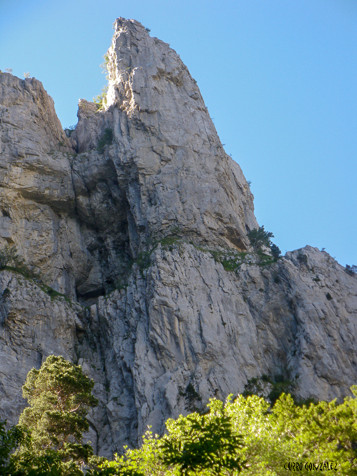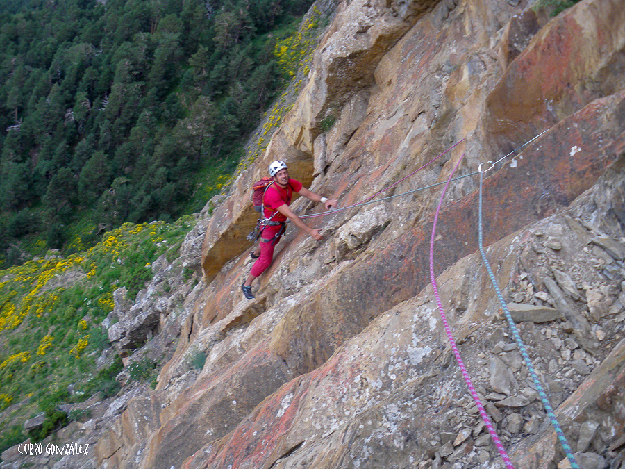 Espolón del Italiano “VÍA KARMELE 200 mts 7b+/c”, aún así nos fuimos a escalar, buscábamos la sombra, pues el calor de nuevo amenazaba. Y de qué forma !.