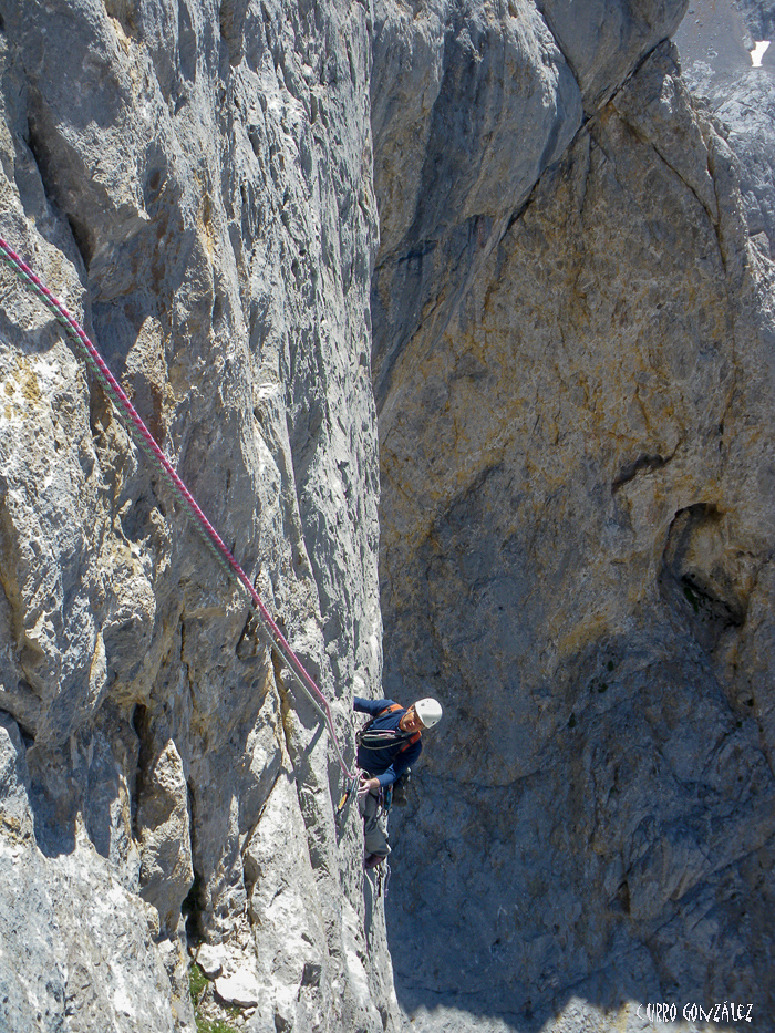 Hace tiempo había escalado la vecina “Mi padre…” y me encanto, pero esta, es que la supera!. Desde el primer largo desplome riglero, con largas tiradas. Y los mejores largos el 3 (6b) y el 4 (6c) que no tiene nada que envidiar a los largos de la Visera.