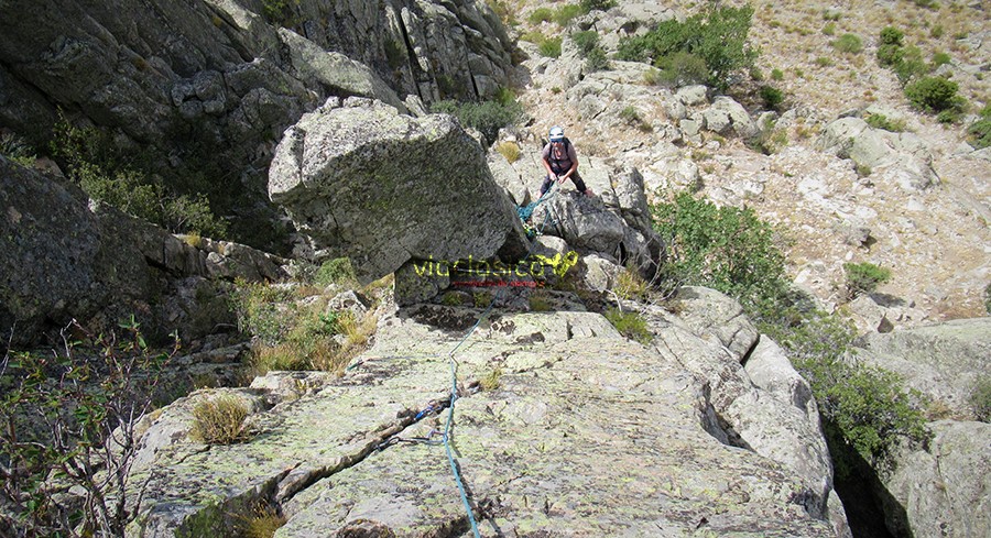 Diedro 6a, asciende de una forma directa un sistema de fisuras hasta llegar a una pequeña brecha para más tarde, contornear y ascender las diferentes puntas mediante pasos aéreos.