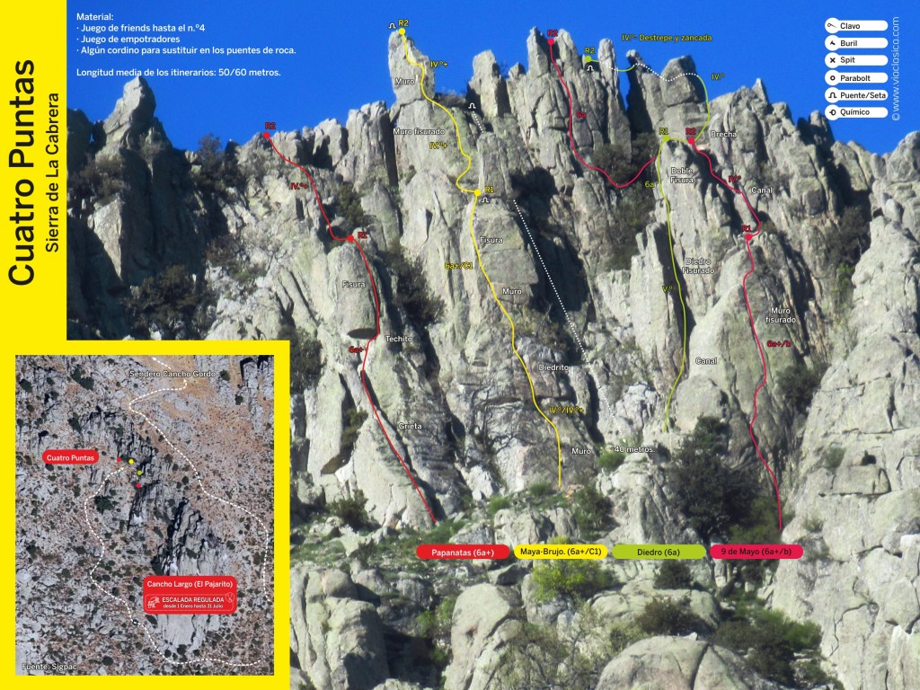 El conjunto de vías de escalada de Cuatro Puntas se encuentra ubicado en las inmediaciones de la cara Oeste del Cancho Largo o Pajarito, casi en lo alto del cordal de la Sierra de la Cabrera, a poca distancia de la cumbre de Cancho Gordo.