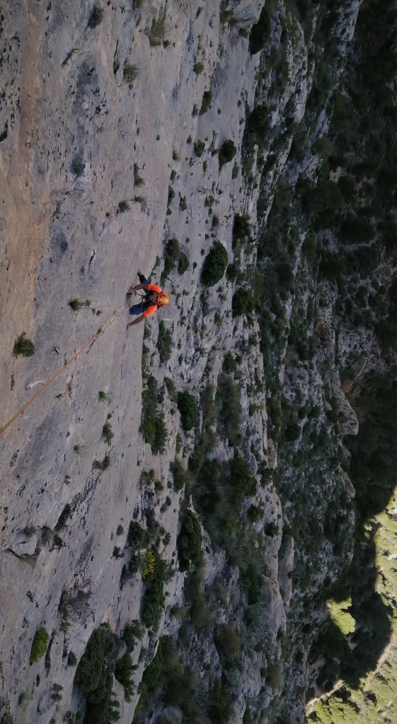 Aunque algún largo se puede empalmar, no creo que sea aconsejable ya que la cuerda roza bastante en la vegetación de la pared y necesitaréis llevar bastantes cintas. Igualmente, aunque aconsejen llevar microfriends o empotradores, gracias al abundante equipamiento se puede escalar la ruta solo con cintas (unas 14).
