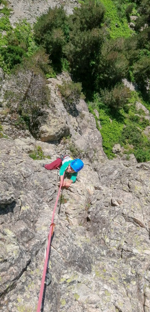 La escalada como he comentado tiene carácter, la roca no es del todo aceptable, aunque el gran número de cordadas que han pasado por su línea han hecho que se limpie y se sanee. La pena (una vez más) es que se queda corta, algo que podemos compensar con la escalada de sus vecinas rutas del Pic Estremere.