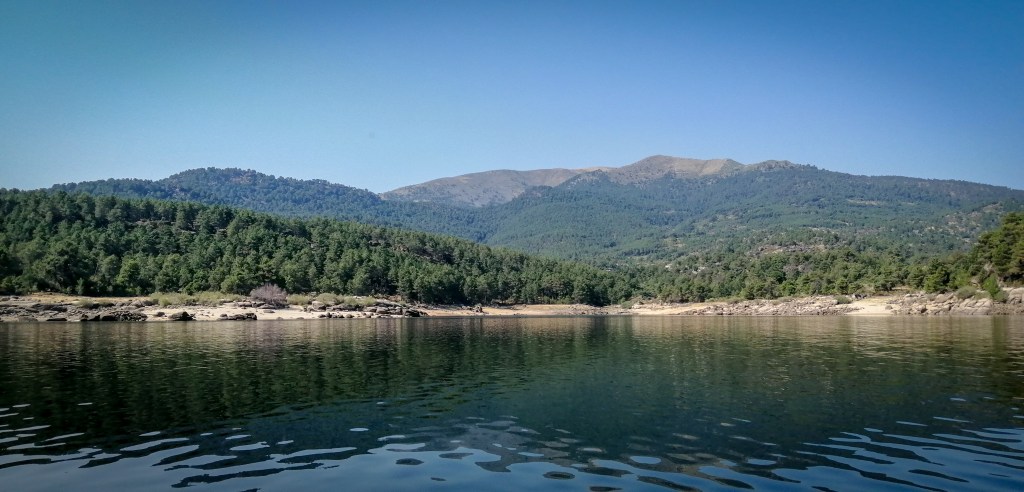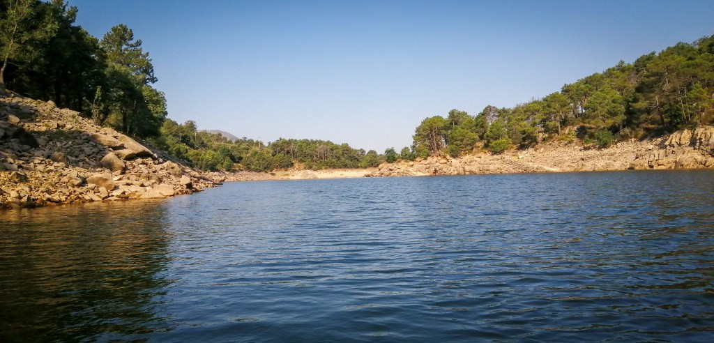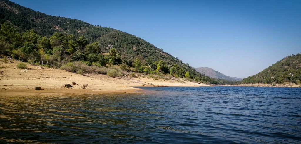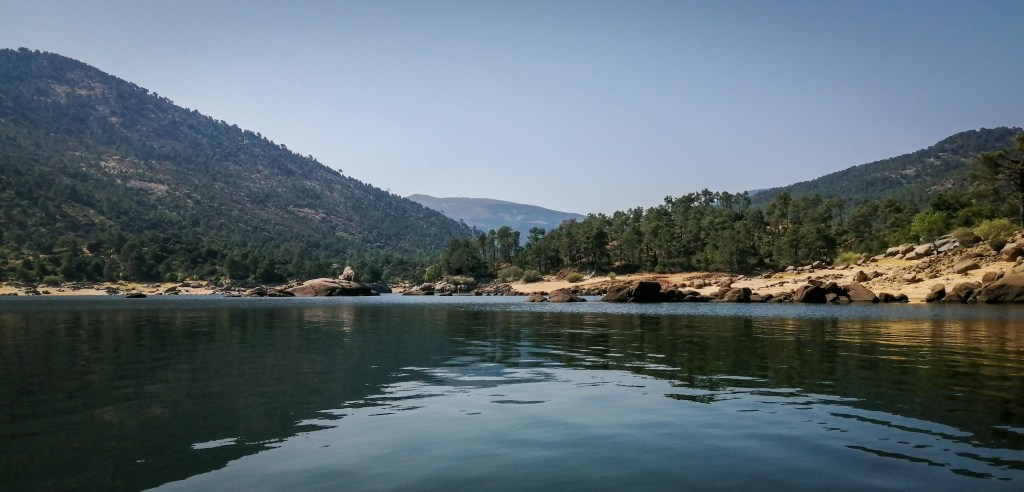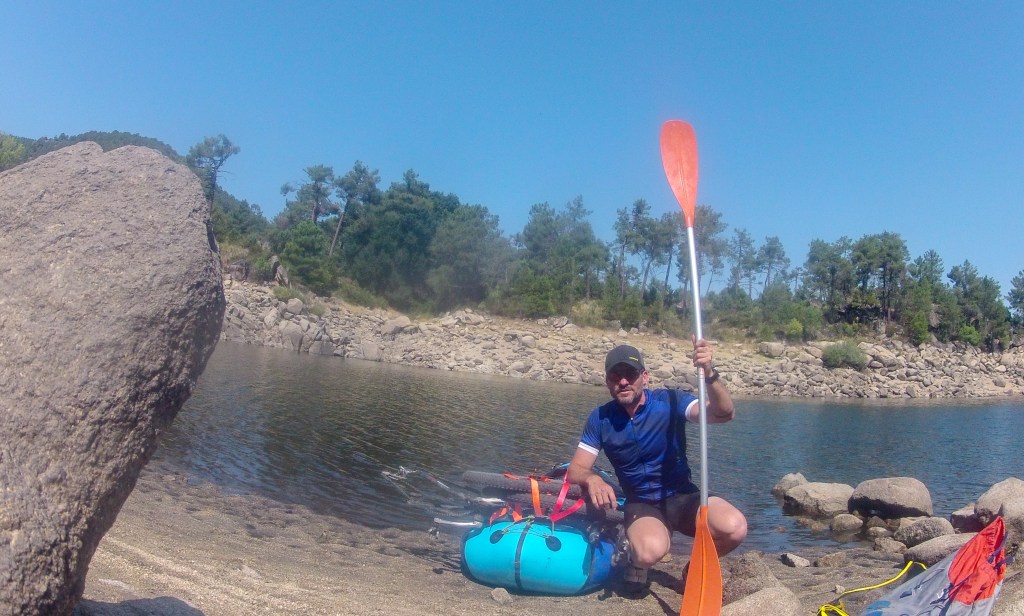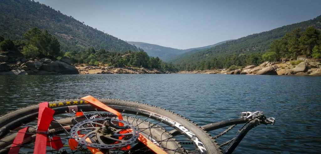 Como no podía ser de otra manera comencé la jornada temprano con los dos materiales imprescindibles para el Bikeraft: El Packraft y la bicicleta, que en este caso era de montaña. La primera parte de la actividad era a través de las aguas del embalse del Burguillo, así que desmonté la bicicleta y la fijé a la proa del Packraft. Elegí la parte más alejada del embalse para comenzar, de tal manera que navegué casi 12 km hasta el punto de desembarco, el largo y bonito meandro que da acceso a la garganta de Iruelas.